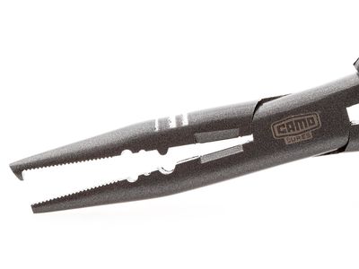 Wer hat sich beim Hakenwechsel nicht schon mal einen Fingernagel am Sprengring eingerissen oder beim Abrutschen eine Hakenspitze ins Fleisch gerammt? Mit der CAMO Lures Sprengringzange CT-200 lassen sich auch große Sprengringe spielend leicht aufdrücken und sicher packen – ganz ohne Verletzungsgefahr! Praktische Zusatzfunktionen wie eine Schneidfläche, Quetschmulden für Klemmhülsen sowie Kerben zum Geradebiegen von Wobblerösen runden die Zange ab. Das stabile Werkzeug wird aus Carbon-Stahl gefertigt und verfügt über einen ergonomisch geformten, rutschsicheren Gummigriff.